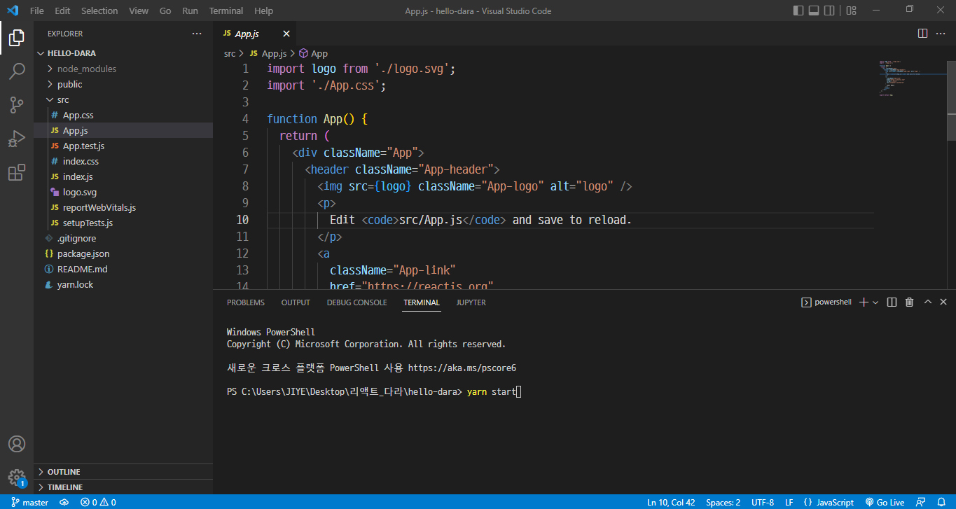"src"라는 폴더 밑의 "App.js"폴더에 코드를 작성할 것 입니다.