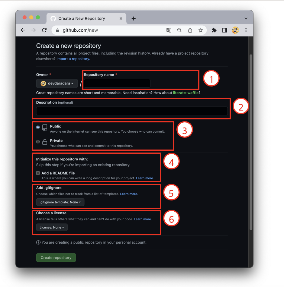2. 저장소 이름을 비롯해 필요한 정보를 입력