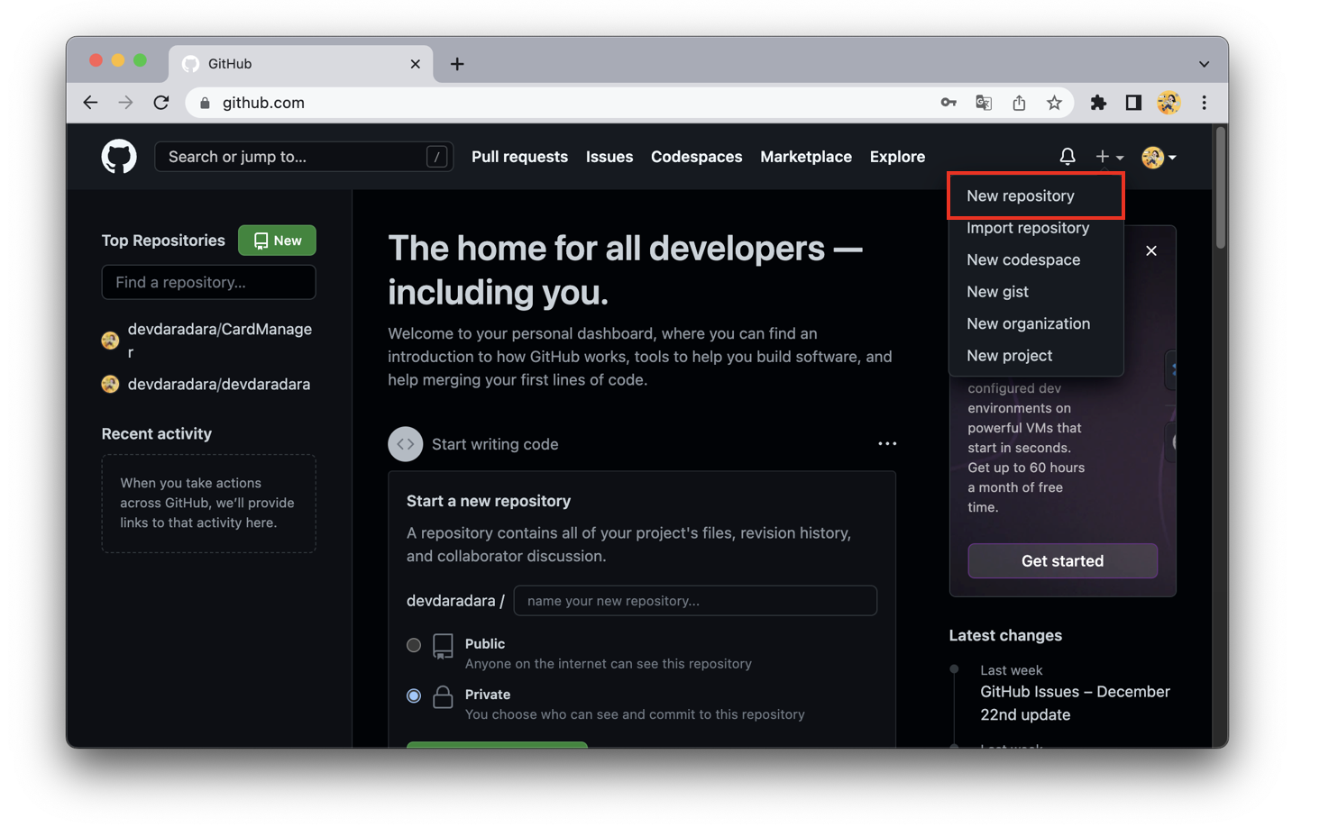 1. 깃 허브에 로그인한 후 화면 오른쪽의 [+] 를 누르고 [New repository]를 선택